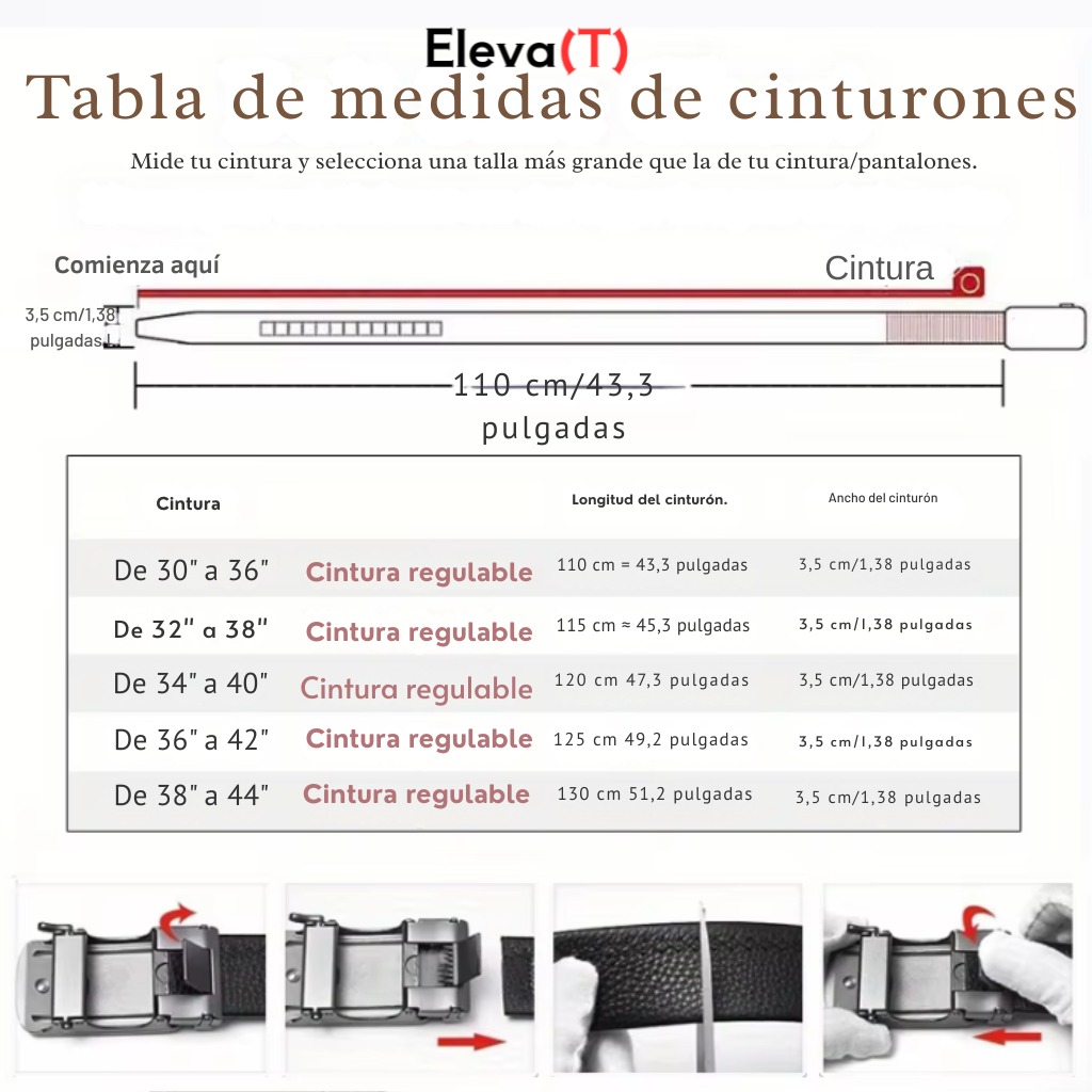 🔝 Tecnología Micro-Track (+400% Precisión): Un riel oculto con más de 30 posiciones de bloqueo para un calce perfecto, estés sentado o de pie. 👌 100% Cuero Genuino: Piel de vaca auténtica diseñada para durar y resistir el uso diario sin perder su forma. ⚙️ Hebilla Automática: Sistema de clic silencioso y liberación rápida. Funcionalidad y lujo en un solo toque. ✂️ Corte a Tu Medida: Viene listo para recortar en casa. Sigue las marcas, corta el excedente y obtén tu talla exacta al instante.